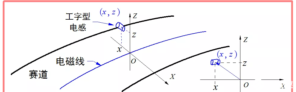 使用一个工字型电感(通常采用10mH配合6.2nF的电容)感知赛道上交变磁场信息,信号的大小与电感在赛道上的方位有关系。简化一下,假设电感的方向始终保持水平且与赛道法线平行,输出感应电压p(x,y)就只与位置有关系。