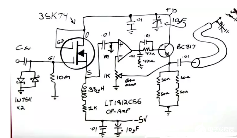 利用三极管、MOS在小的偏置下的非线性,可以完成信号的检波。它相当于带有偏置的二极管检波+三极管放大电路,所以这种检波效率高,增益更大,输出阻抗变小。下图所示的为两级MOS,BJT晶体管高频检波电路。