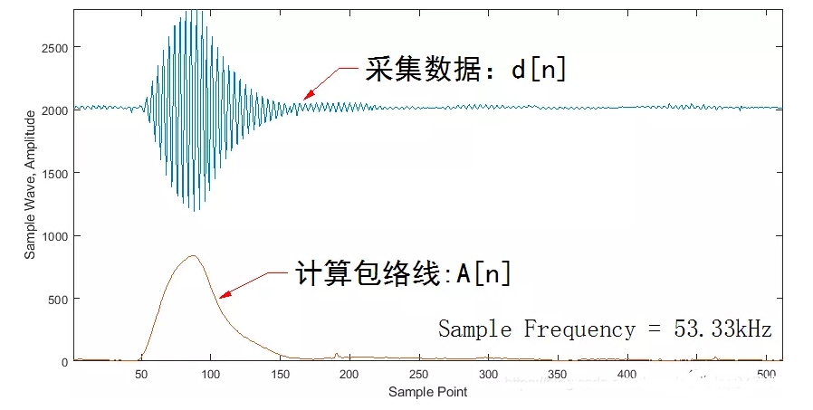 超声波的频率为40kHz,采样频率为53.33kHz。采用的周期等于信号载波周期的3/4,因此相邻两个采样数据在载波相位上相差-90°(270°),因此计算相邻两个采样数据的均方根便可以得到信号的包络线。