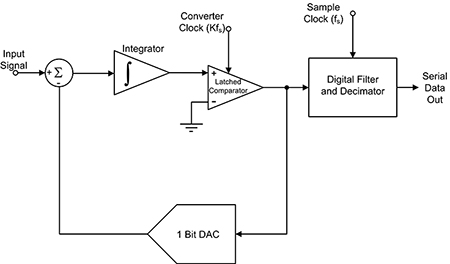 三角积分 ADC 可针对低频信号提供最高的分辨率(16 到 24 位)。与双斜率 ADC 一样,它是另一种类型的积分数字化仪(图 5)。输入信号通过一个加法器施加到积分器。积分器的输出随即施加于一个闩锁比较器,并在其中与零电压(接地)信号进行比较。如果积分输出不为零,则会反馈比较器输出,从而使积分器输出更接近零。以转换器的时钟速率重复此过程,直至积分器输出达到零。比较器输出构成一个串行数据流,即转换器的数字输出。