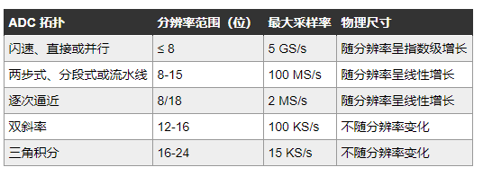 表 2 概括了所讨论的五种 ADC 类型的分辨率和最大采样率。