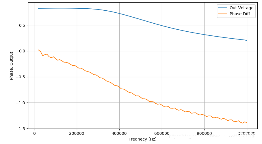将输出信号的幅度以及它与输入信号之间的相位差绘制出来,可以清楚看到频率引起的变化。随着信号频率的增加,输出信号的幅值下降,相位在逐步落后。