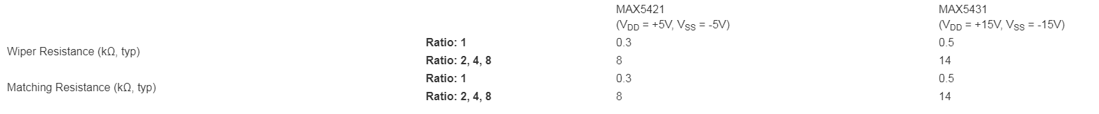 表1. MAX5421/MAX5431分压器匹配电阻设置