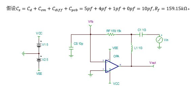 在对理想跨阻放大器的稳定性进行分析之后,让我们进一步考虑实际情况,把PD的结电容和运放的输入电容考虑进来。