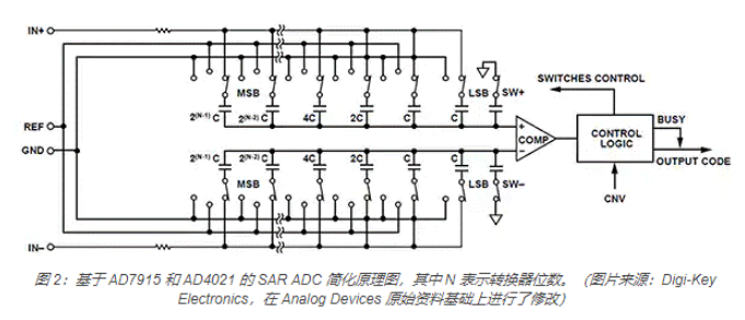 以 Analog Device 的 AD7915 (16 位)和 AD4021(20 位)SAR ADC 为例观察 ADC 内部,可以看到该器件使用了电荷再分配数模转换器 (DAC)。容性 DAC 有两个相同的二元加权电容阵列。这两个电容阵列连接非反相和反相比较器输入端(图 2)。