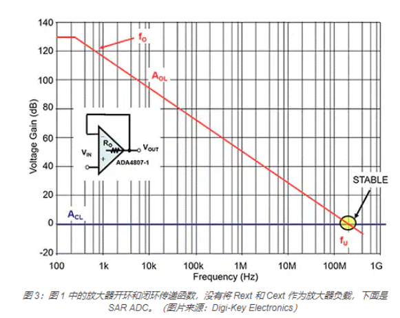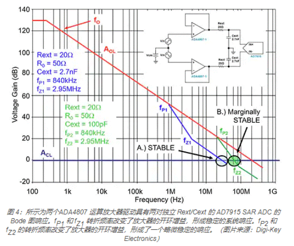 如图 4 所示,由于电路在初始采集时 ADC 的电容负载和 ADC 的开关电荷注入,有可能发生振荡。Rext/Cext 放大器输出元件所产生的额外极点和零点保证了系统稳定,所以开环和闭环增益曲线交点大于 20dB/ 十倍频程,使相位裕度小于 45°。这种配置与 fP2 和 fZ2 一起构成一个不稳定电路。