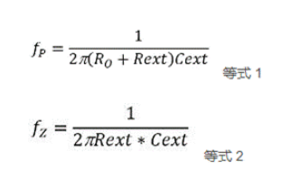 为避免不稳定,在评估电路中带有 Rext 和 Cext 的放大器开环增益曲线时,设计人员需要考虑放大器的开环输出电阻 RO 的影响。阻值为 50 欧姆 (W) 的 RO 与 Rext、Cext 的组合通过引入一个极点(fP,公式 1)和一个零点(fZ,公式 2)来修正开环响应曲线。RO、Rext 和 Cext 的值决定了 fP 的转折频率。Rext 和 Cext 的值决定了零转折频率 fZ。