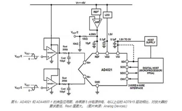 使用单路 5 伏电源的 AD4021 的推荐连接图似乎具有类似电路图。但对放大器的要求降低了,Rext/Cext(R 和 C)的值更小(图 6)。