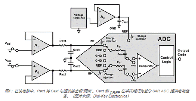 SAR ADC 驱动电路具有将 ADC 与其信号源隔离的运算放大器(A1 和 A2)(图 1)。在该电路中,Rext 通过“隔离”放大器的输出级与 ADC 容性负载(CIN+ 和 CIN-)和 Cext 隔离来保持稳定。Cext 和 CREF 为 ADC 提供了一个近乎完美的输入源,可以吸收来自 IN+、IN- 和 REF 输入端子的开关电荷注入。输入端子 (IN+, IN-) 在转换器的采集期间跟踪输入信号 (VSIG+, VSIG-) 的电压,为 ADC 输入采样电容 CIN+ 和 CIN- 充电。