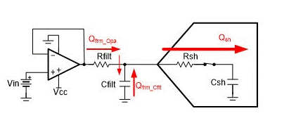1:对 ADC 的 Csh 进行充电,由于 ADC 采样保持阶段需要输入给采样保持电容 Csh 充电。如图所示,开始采样时,Csh 的电荷由输入部分(Qfrm_opa)和 RC 滤波电容(Qfrm_cflit)提供,保证在一定时间内达到精度的要求。显然,随着采样精度和采样率的不断提高,驱动 ADC 的难度加大,因为必须在有限的时间内采样时间(tacq)内将 Csh 上的电压达到满足精度要求(1/2LSB 内)。所以我们在 ADC 前加入电容,当采样保持阶段时对 Csh 进行充电,保证采样的精度。电阻则作为隔离作用,避免运放直接驱动容性负载,提升系统的稳定性。