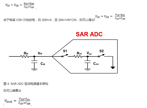 如下图所示为 SAR ADC 的简化原理图,以最坏的情况,CSH 对地放电为例。当开关 S1 关闭时,开关 S2 打开时,电容 CIN 与 CSH 共享电荷可得出等式