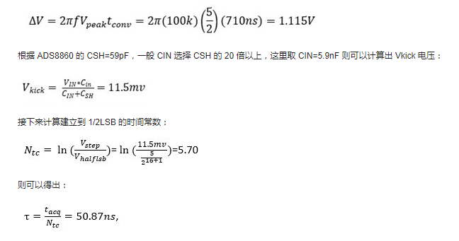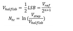 其中 tacq 为采集时间 Ntc 为建立所需的时间常数数目。所需的时间常数数目可以通过计算阶跃大小 VSTEP 与建立误差(本例为 1/2LSB)之比的自然对数来获得:
