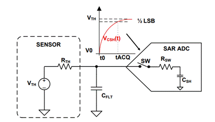 在 ADC 的采集阶段,ADC 建立至 1/2LSB 所需要的 RC 时间常数
