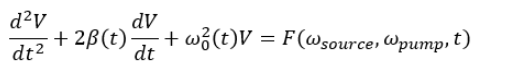 根据基尔霍夫电压定律,由于输入源,其RLC支路,R2和C3形成闭环,因此该环路形成了一个具有固有频率和阻尼的周期性调制的阻尼振荡器。这种类型的系统称为参量振荡器,通过阻尼Mathieu方程进行描述。
