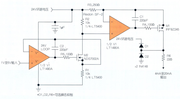 将典型值为 1V 至 5V 的输出(通常来自DAC)加到运算放大器 IC1 A的非反相输入。这个电压通过 FET Q2将通过 R1 的电流准确地设定为VIN/R1。相同的电流通过 R2 拉低,因此 R2 底端的电压为 24 V 环路电源电压减去输入电压。这部分电路有3个主要误差源:R1 和 R2 的匹配,IC1A的失调电压,以及 Q2 的泄漏电流。