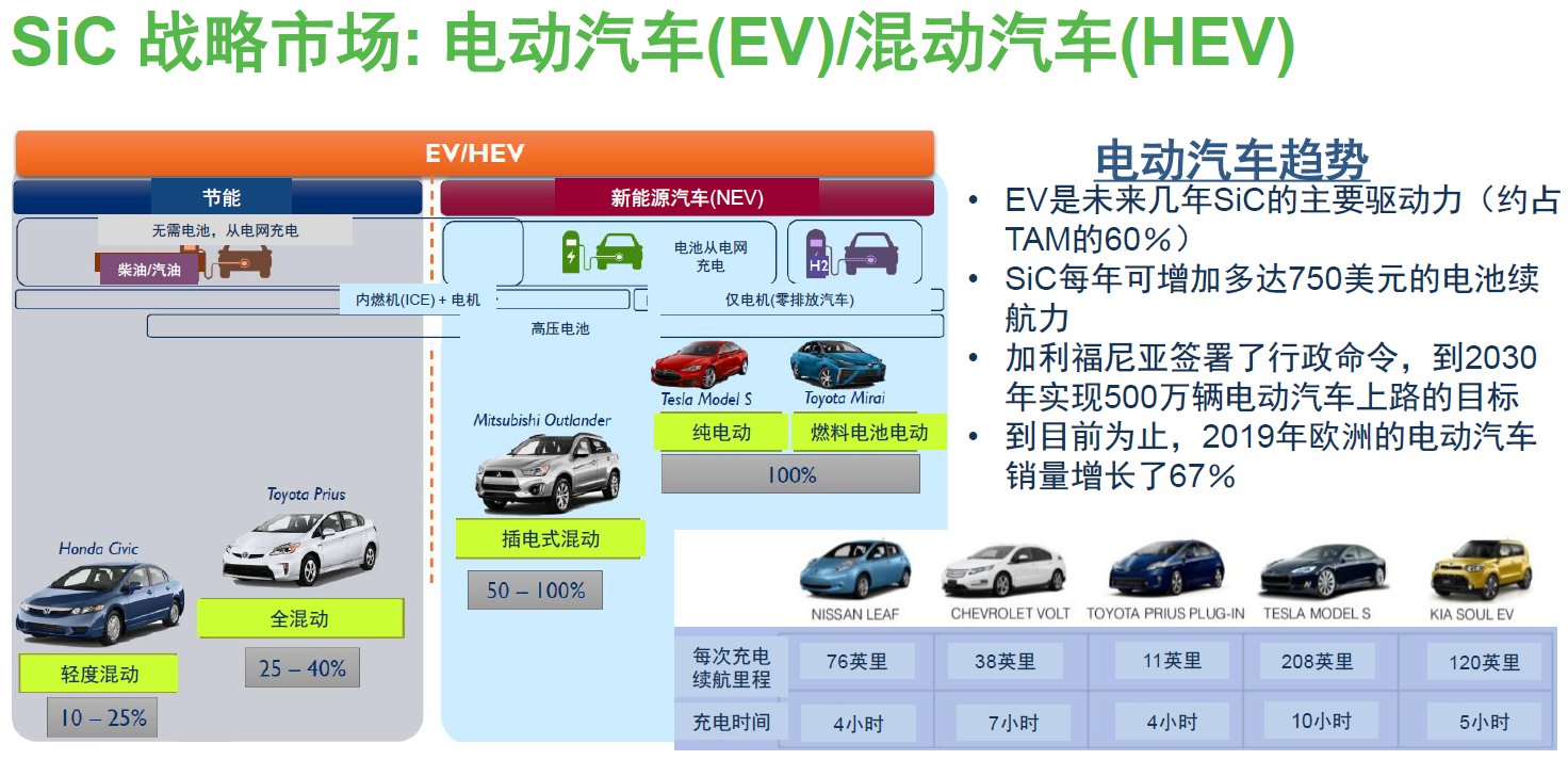 具体来说,SiC在汽车中的应用包括在电动汽车和混动汽车上的应用。王利民预计电动汽车会是未来SiC的主要驱动力之一,占整个SiC总体市场容量的60%。