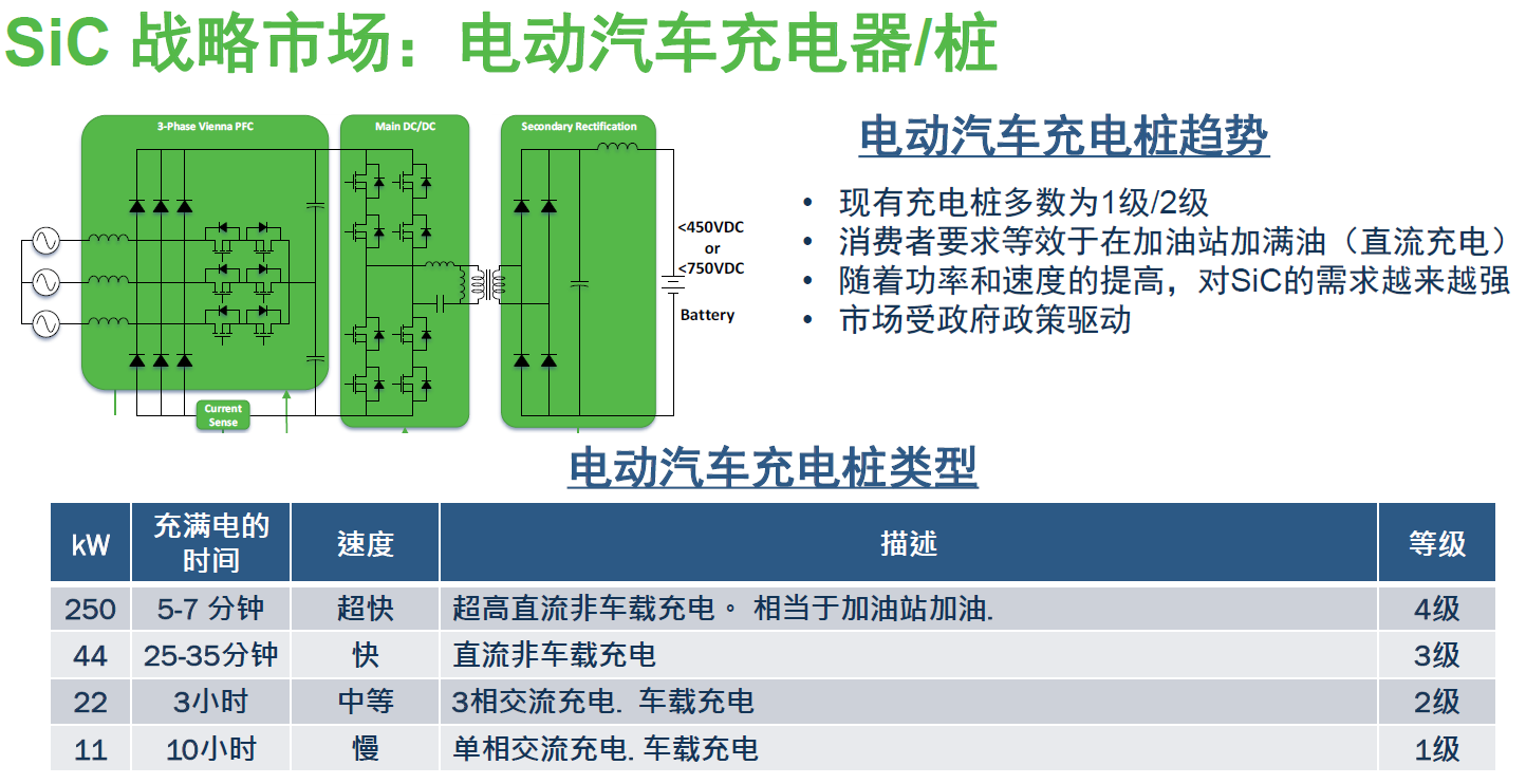 当然,充电桩实现的方案有很多种,现在消费者最感兴趣的就是直流快充。直流快充的充电桩需要非常大的充电功率以及非常高的充电效率,这些都需要通过高电压来实现。在电动汽车充电桩的应用里,碳化硅无论是在Boost,还是输出的