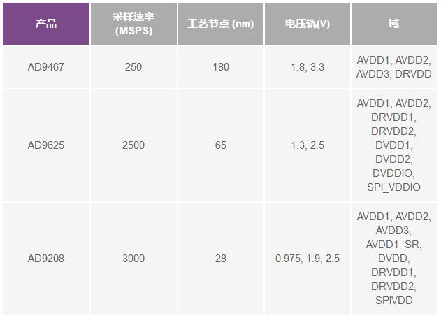 对更宽采样带宽的需求促使业界采用更精细的几何尺寸,不过对数据转换器性能(如噪声和线性度)的期望仍然存在。这对模拟设计提出了独特的挑战。转向更小几何尺寸的一个不希望出现的结果是电源电压降低,这使得开发模拟电路以工作在高采样速率并保持相同的噪声/线性度性能所需的裕量大大降低。为了克服这一限制,电路设计有不同的电压轨以提供所需的噪声和线性度性能。