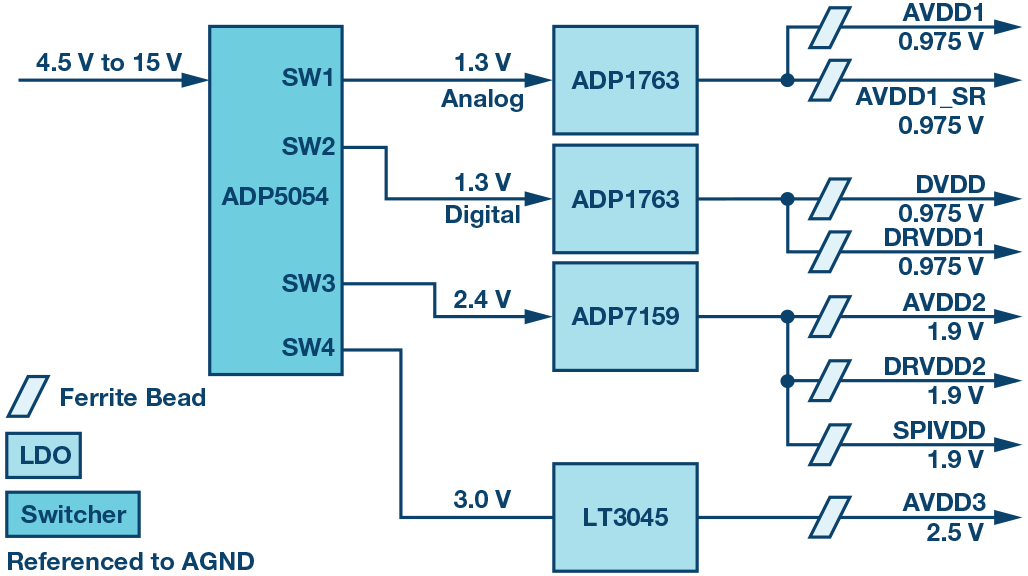 图3. AD9208 PDN,DC-DC转换器为所有域供电
