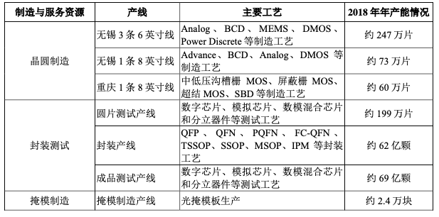 从晶圆制造产线来看,目前华润微电子在无锡拥有3条6英寸线,1条8英寸线,2018年年产能分别约247万片和73万片。在重庆拥有1条8英寸线,2018年年产能约60万片。