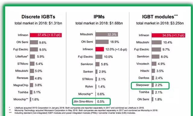 在这个外资公司占据绝对话语权的领域,2018年的IGBT前十强里面有两家中国公司入围全球前十,分别是在智能模块市场排名第十的吉林华微(Jinlin Sino-Micro)和在模块市场排名第八的嘉兴斯达(StarPower)。据证券日报的消息,2020年2月4日,嘉兴斯达(斯达半导体)在上海证券交易所主板成功上市,这是国内IGBT领域继士兰微、吉林华微之后的第三家上市公司,斯达半导体主营业务是以IGBT为主的功率半导体芯片和模块的设计研发和生产,并以IGBT模块形式对外实现销售。2018年在全球IGBT模块市场排名第八位,在全球占据2.2%的市场份额。