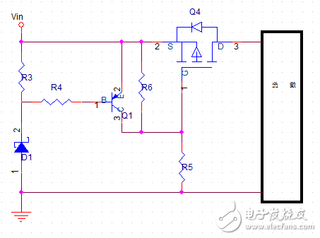 当Vin输入大于正常输入电压,此时Vin>Vbr,稳压管被击穿,其上电压为Vbr。PNP三极管Q1导通,VCE≈0,即PMOS管的Vgs≈0,PMOS管不导通,电路断路,即实现了过压保护。