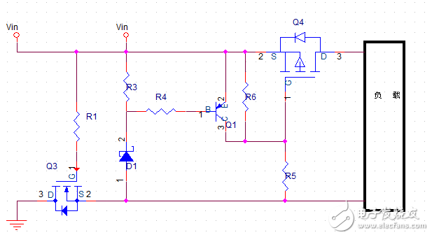 Vin正常输入电压时,稳压管没有反向击穿,R3,R4电流基本为0。PNP三极管的Vbe=0,即PNP三极管不导通。PMOS管Q4的Vgs由电阻R5,R6分压决定,PMOS管导通,即电源正常工作。