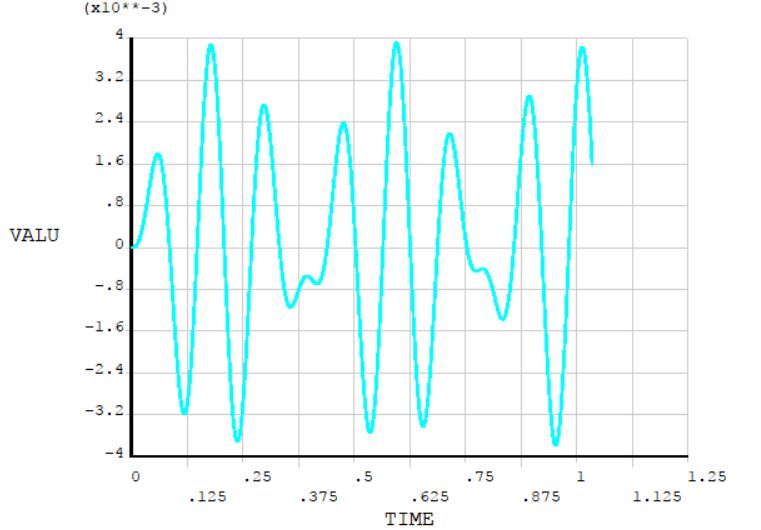 这是一个很典型的动力学题目,需要验证跨中电机运转时梁的强度和变形。在有限元分析中,当然首先需要计算位移,也就是梁的挠度。这个用户是能够熟练操作ANSYS软件的,他根据电机运转频率,在结构上施加了一个随时间正弦变化的函数荷载,对结构进行了瞬态分析,计算时间为10个运转周期,施加的荷载时间历程及计算的梁跨中挠度时间历程曲线分别如图8和图9所示。