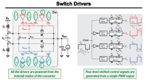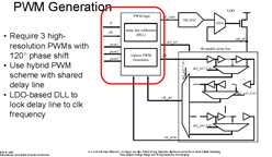 结合上面两图试着解读一下该方案变换器的整体架构,数字部分是基于FPGA的数字控制,个人推测应该是因为预研和验证采用FPGA比较方便,验证成功之后应该会将控制部分集成进芯片。其控制思路为,ADC采样VOUT和VIN计算出当前占空比,再与目标占空比进行比较,如果小于目标占空比,则增大当前占空比d,然后通过DAC转换去调制DLL的延时,从而生成相位差固定三路驱动的PWM波形,该波形经过level-shift转换后去驱动开关管SW1~SW6。