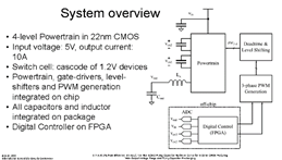 INTEL的文章这篇文章的主要特色是在22nm工艺下实现了高效率低压大电流的输出(峰值效率达到了93.8%),通过多级多相位的架构选择,提高了开关频率,从而提高了load-transient的响应速度,并减小了电感面积,同时采用片上集成电容电感缩减了供电模块所占面积。