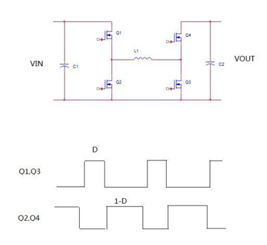如上图所示,Q1和Q3同时工作,Q2和Q4同时工作,并且两组MOS交替导通。对于这种控制方式,在CCM情况下我们可以得到公式: