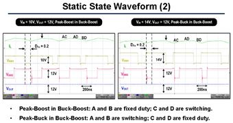 这个电压转换比和我们常见的buck-boost是一样的,这种控制方式的优点是控制方式简单,没有模态切换。但是缺点是,四个管子都在一直工作,损耗大,共模噪音也大。