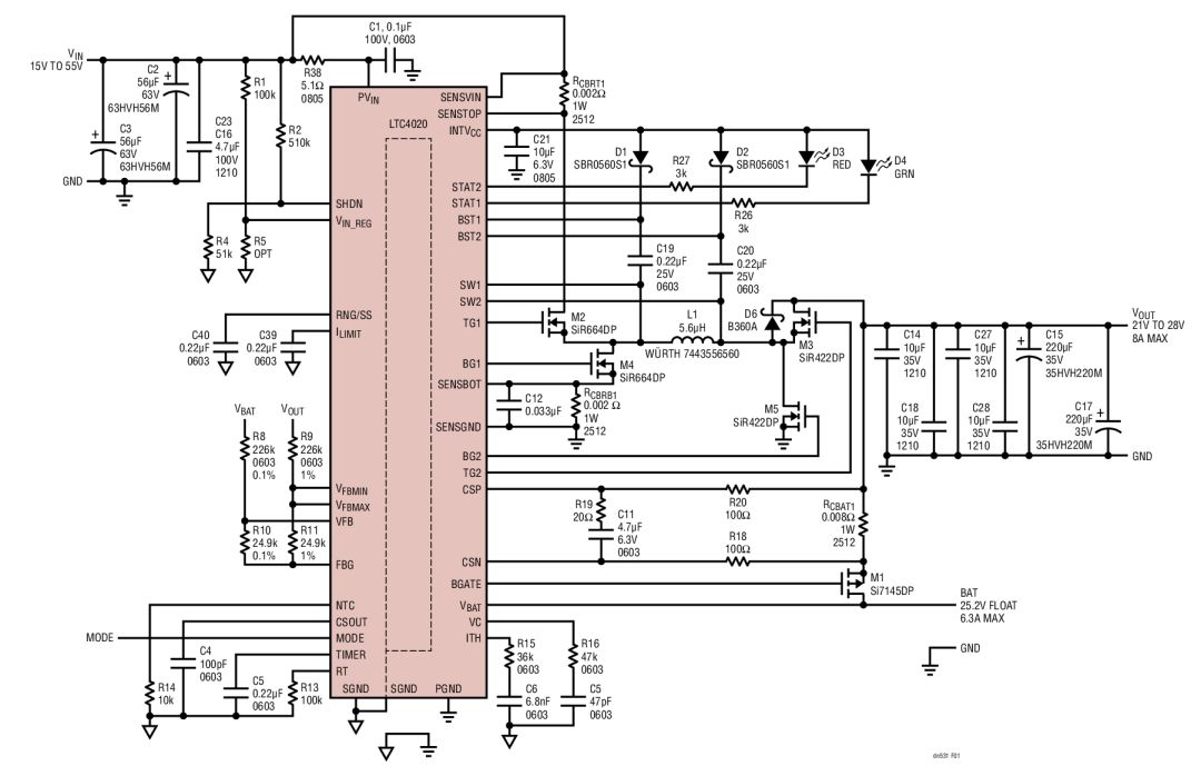 图 1 示出了一个 15V 至 55V 输入、25.2V/6.3A 降压-升压电池充电器,其具有一个高效率四开关 (M2~M5) 同步降压-升压型 DC/DC 转换器,仅需一个电感器 (L1)。专有的平均电流模式架构采用两个检测电阻器 (RCBRT1和 RCBRB1) 来监视电感器电流。在该降压-升压型解决方案中,当 VIN高于 VOUT 时,转换器在降压模式工作;当 VIN 低于 VOUT 时,转换器则工作在升压模式。当 VIN接近 VOUT时,转换器工作于四开关降压-升压模式。