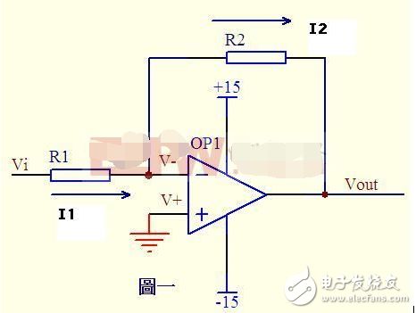 图一运算放大器的同向端接地=0V,反向端和同向端虚短,所以也是0V,反向输入端输入电阻很高,虚断,几乎没有电流注入和流出,那么R1和R2相当于是串联的,流过一个串联电路中的每一只组件的电流是相同的,即流过R1的电流和流过R2的电流是相同的。流过R1的电流I1=(Vi-V-)/R1……a流过R2的电流I2=(V--Vout)/R2……bV-=V+=0……cI1=I2……d求解上面的初中代数方程得Vout=(-R2/R1)*Vi这就是传说中的反向放大器的输入输出关系式了。