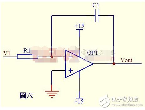 图六电路中,由运算放大器的虚短知,反向输入端的电压与同向端相等,由虚断知,通过R1的电流与通过C1的电流相等。通过R1的电流i=V1/R1通过C1的电流i=C*dUc/dt=-C*dVout/dt所以Vout=((-1/(R1*C1))∫V1dt输出电压与输入电压对时间的积分成正比,这就是传说中的积分电路了。若V1为恒定电压U,则上式变换为Vout=-U*t/(R1*C1)t是时间,则Vout输出电压是一条从0至负电源电压按时间变化的直线。