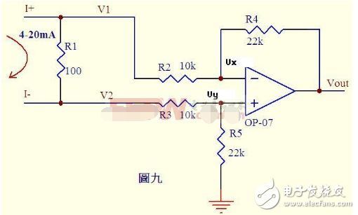 很多控制器接受来自各种检测仪表的0~20mA或4~20mA电流,电路将此电流转换成电压后再送ADC转换成数字信号,图九就是这样一个典型电路。如图4~20mA电流流过采样100Ω电阻R1,在R1上会产生0.4~2V的电压差。由虚断知,运算放大器输入端没有电流流过,则流过R3和R5的电流相等,流过R2和R4的电流相等。故:(V2-Vy)/R3=Vy/R5……a(V1-Vx)/R2=(Vx-Vout)/R4……b由虚短知:Vx=Vy……c电流从0~20mA变化,则V1=V2+(0.4~2)……d由cd式代入b式得(V2+(0.4~2)-Vy)/R2=(Vy-Vout)/R4……e如果R3=R2,R4=R5,则由e-a得Vout=-(0.4~2)R4/R2……f图九中R4/R2=22k/10k=2.2,则f式Vout=-(0.88~4.4)V,即是说,将4~20mA电流转换成了-0.88~-4.4V电压,此电压可以送ADC去处理。