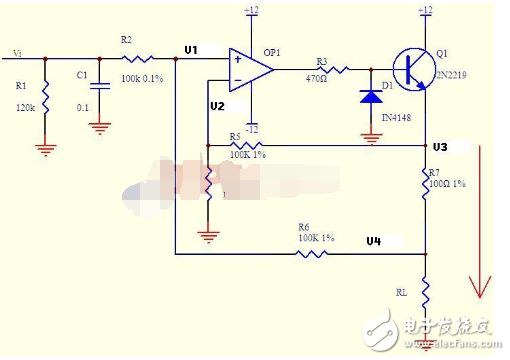 电流可以转换成电压,电压也可以转换成电流。图十就是这样一个电路。上图的负反馈没有通过电阻直接反馈,而是串联了三极管Q1的发射结,大家可不要以为是一个比较器就是了。只要是放大电路,虚短虚断的规律仍然是符合的!