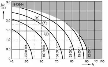图2 某铝电解电容器的寿命与温度、纹波电流的关系