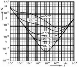 在开关稳压电源中作为输出滤波用的电解电容器,由于大多数的开关电源工作在方波或矩形波的状态,含有及其丰富的高次谐波电压与电流,其上锯齿波电压的频率高达数十千赫,甚至数十兆赫,它的要求和低频应用时不同,电容量并不是主要指标,衡量它好坏的则是它的阻抗频率特性,如图3所示。