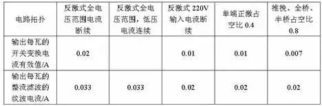 一般而言,反激式变换器产生的开关变换电流相对最大。表1是各种开关变换器电路拓扑的直流电流、整流滤波的纹波电流、开关变换电流和滤波电容上的总纹波电流。