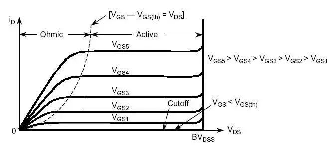 该参数反映了器件可以处理的脉冲电流的高低,脉冲电流要远高于连续的直流电流。定义IDM的目的在于:线的欧姆区。对于一定的栅-源电压,MOSFET导通后,存在最大的漏极电流。如图所示,对于给定的一个栅-源电压,如果工作点位于线性区域内,漏极电流的增大会提高漏-源电压,由此增大导通损耗。长时间工作在大功率之下,将导致器件失效。因此,在典型栅极驱动电压下,需要将额定IDM设定在区域之下。区域的分界点在Vgs和曲线相交点。