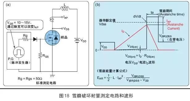 L是电感值,iD为电感上流过的电流峰值,其会突然转换为测量器件的漏极电流。电感上产生的电压超过MOSFET击穿电压后,将导致雪崩击穿。雪崩击穿发生时,即使 MOSFET处于关断状态,电感上的电流同样会流过MOSFET器件。电感上所储存的能量与杂散电感上存储,由MOSFET消散的能量类似。