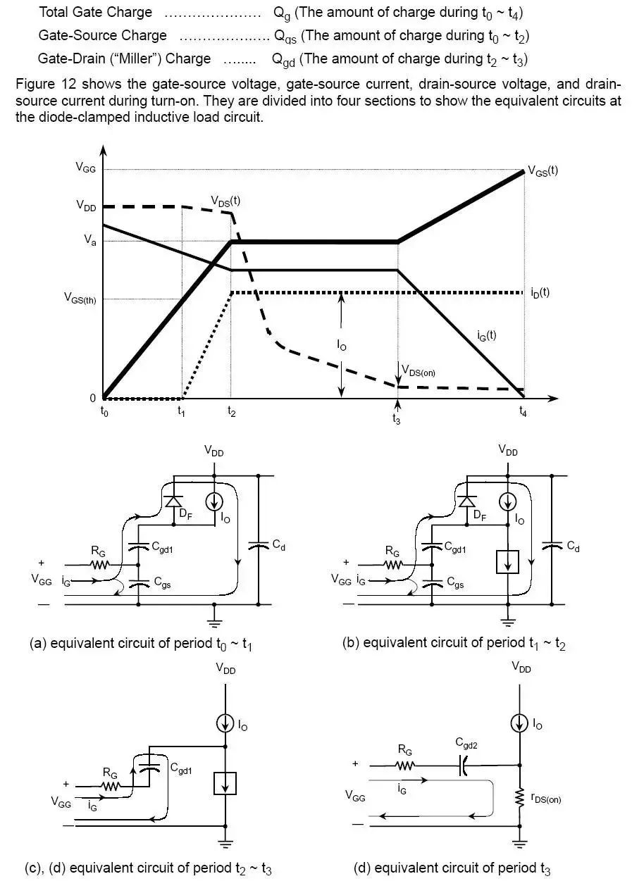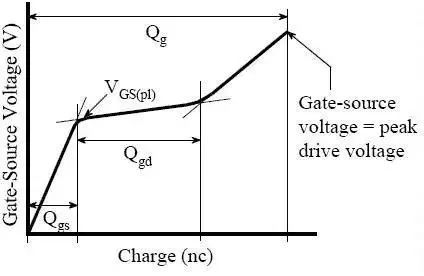 Qgs从0电荷开始到第一个拐点处,Qgd是从第一个拐点到第二个拐点之间部分(也叫做“米勒”电荷),Qg是从0点到VGS等于一个特定的驱动电压的部分。