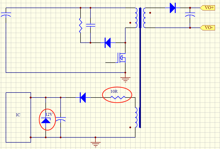 如果在正常情况下,比如Vcc绕组的上端为正下端为负的时候,上端对地电位为14V,经过限流电阻和Vcc整流二极管到稳压管和芯片,此时我们计算一下稳压管和IC以及Vcc电容共同消耗的电流:在不考虑二极管压降的情况下,Iic+Izener+Ic=(14-12)/10=0.2A,假设占空比为0.5,此时稳压管和IC共同消耗的功率为12*0.2*0.5=1.2W,除掉一部分Vcc电容上的电流,虽然没有1.2W但IC和稳压管消耗的功率还是比较大,然后芯片的电流主要用来做mos管的驱动消耗是比较小的,所以大部分功耗在稳压管上。