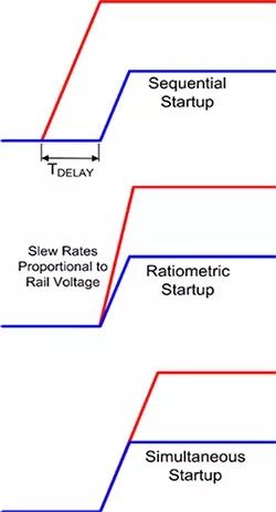 第二种定序技术是比率定序。在该技术中,电源轨会同时启动并同时达到各自的额定电压。这就需要电源轨上升时间与电源轨电压成正比,才能同时实现稳压。