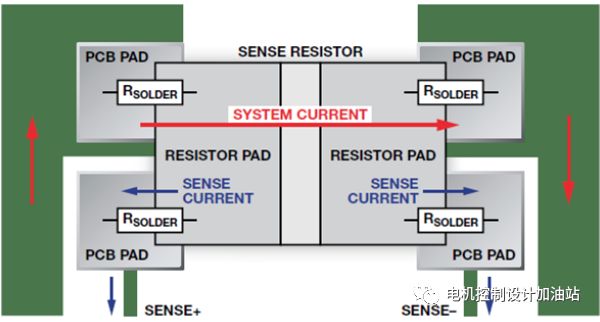 为了避免增加电阻,需要把电压检测走线正确的布局到检测电阻焊盘处。系统电流将在上部焊点导致显著的压降,但检测电流则会在下部焊点导致可以忽略不计的压降。可见,这种焊盘分离方案可以消除测量中的焊点电阻,从而提高系统的总体精度。
