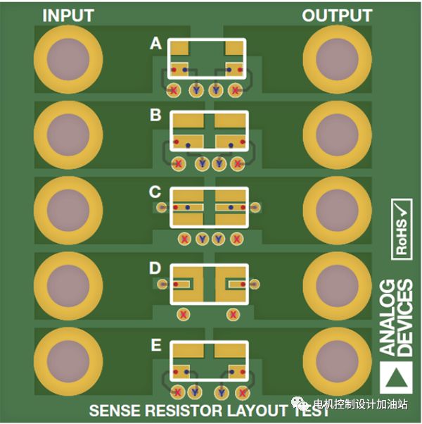 电流检测电阻有多种形状和尺寸可供选择,用于测量诸多汽车、功率控制和工业系统中的电流。使用极低值电阻(几 mΩ或以下)时,焊料的电阻将在检测元件电阻中占据很大比例,结果大幅增加测量误差。高精度应用通常使用 4 引脚电阻和开尔文检测技术以减少这种误差,但是这些专用电阻却可能十分昂贵。另外,在测量大电流时,电阻焊盘的尺寸和设计在确定检测精度方面起着关键作用。本文将描述一种替代方案,该方案采用一种标准的低成本双焊盘检测电阻(4 焊盘布局)以实现高精度开尔文检测。图 1 所示为用于确定五种不同布局所致误差的测试板。