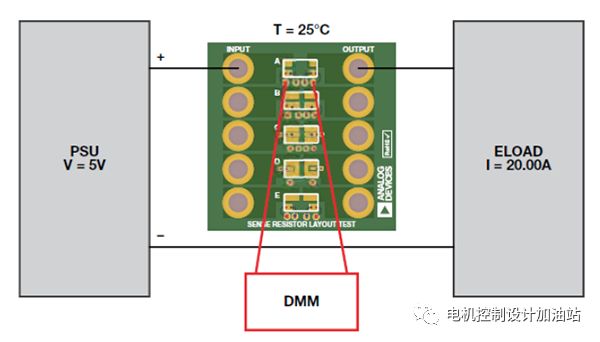 测试设计如图 5 所示。使 20 A 的校准电流通过各个电阻,同时使电阻保持在 25°C。在加载电流后 1 秒内,测量产生的差分电压,以防止电阻温度升高 1°C 以上。同时监控各个电阻的温度,以确保测试结果均在 25°C 下测得。电流为 20 A 时,通过 0.5 mΩ 电阻的理想压降为 10 mV。