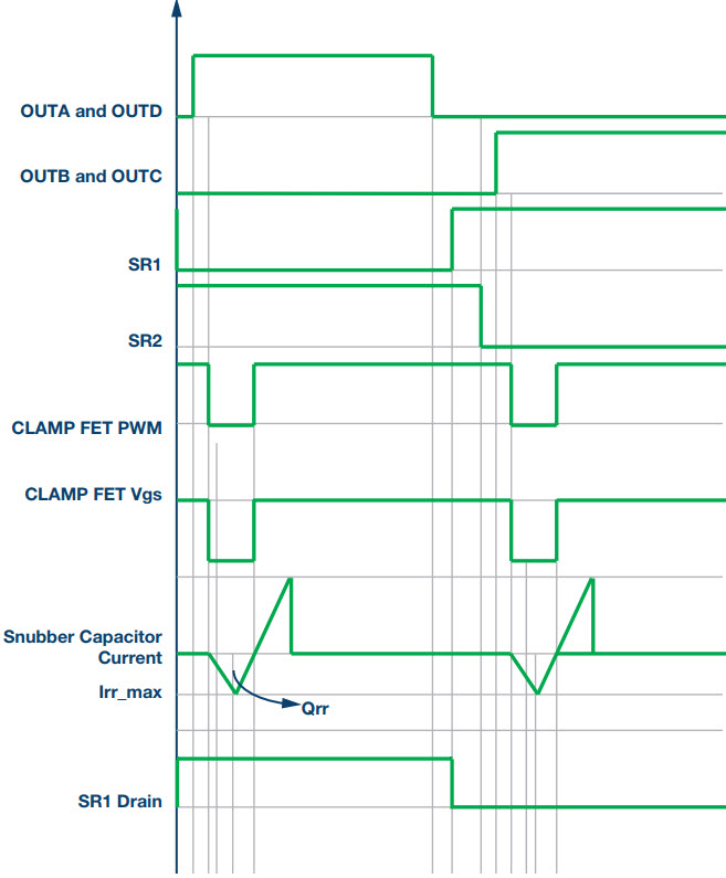 这两项为驱动器的传播延迟和原边MOSFET的驱动信号上升时 间。这个时序非常重要,因为必须捕获MOSFET体二极管的全部 反向恢复能量。该时间取决于同步MOSFET体二极管的反向恢复 特性(Qrr、trr、Irr),可能随器件上的温度、负载电流和反向电 压等因素而变化。延迟时间和吸收器导通时间可以用本文所述 方法精确设置以针对不同的开关特性进行优化。