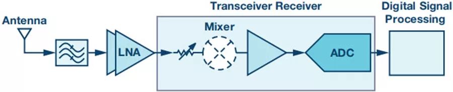 现在我们来比较一个简化的收发器接收信号链。可以看到,收发器接收信号链的物料清单少于类似的分立器件信号链。此外,收发器片内含有两个发射器和两个接收器。看似简单的集成隐藏了接收器设计的精致,后者通常可实现 12 dB 的噪声系数。图 2 所示的以下分析说明了系统如何实现高灵敏度。